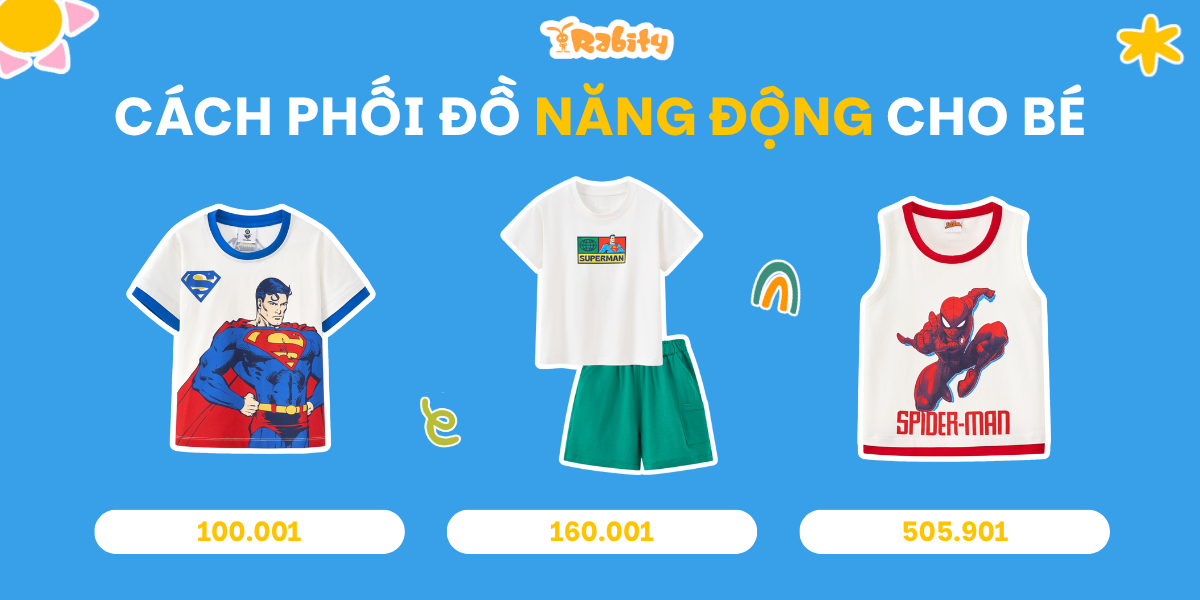 Ví dụ, một bộ trang phục năng động có thể là: áo thun in hình Spider-Man, quần jogger màu xám và một đôi giày sneakers trắng. Để tăng thêm sự nổi bật, cha mẹ có thể thêm mũ lưỡi trai hoặc balo nhỏ cho bé.