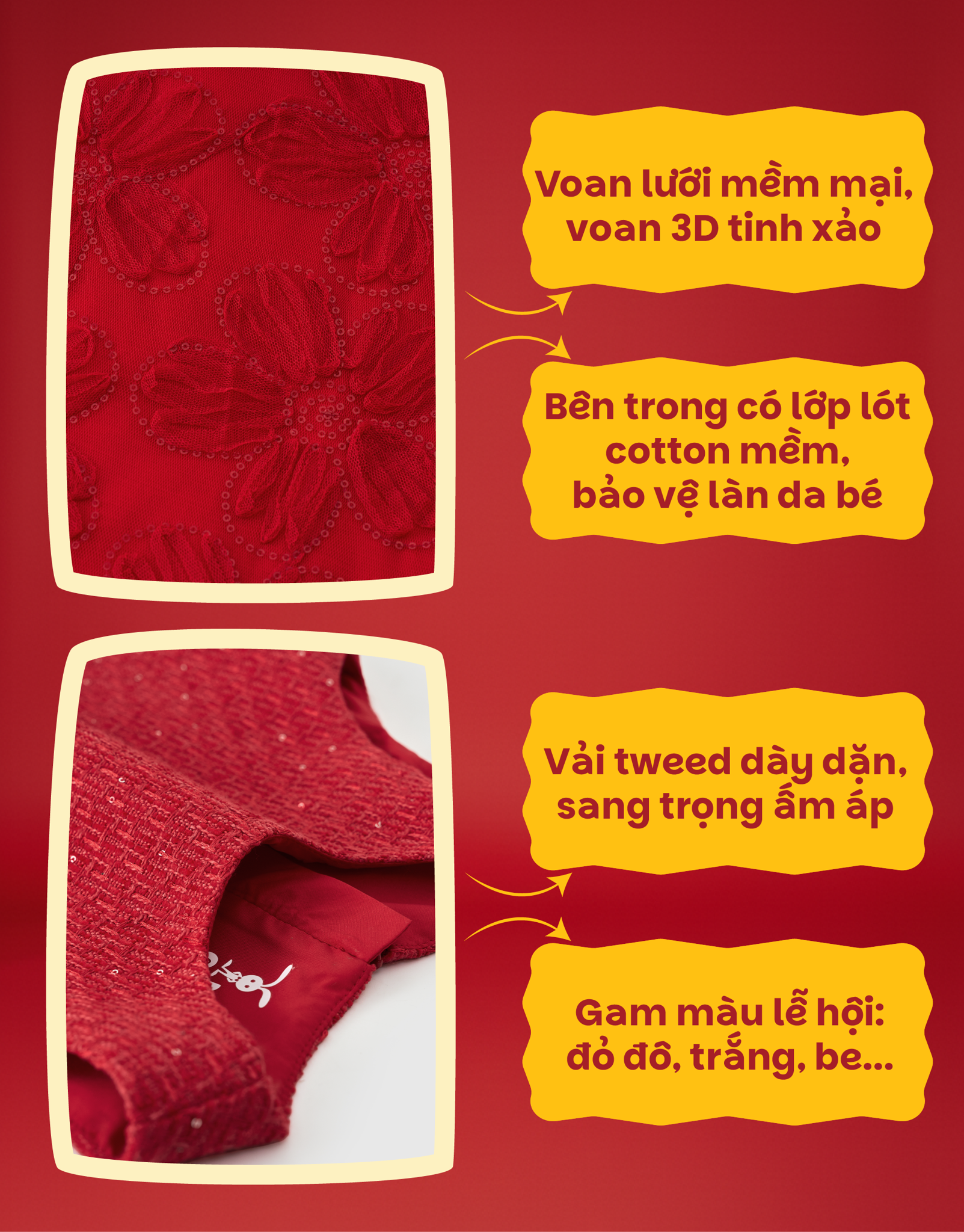 - Màu sắc lễ hội - rạng rỡ nhưng vẫn dễ ứng dụng: Sắc đỏ trong BST Spark of Joy mang lại hiệu ứng nổi bật khi chụp hình, đi tiệc hay tham gia các hoạt động đông người. Tuy nhiên, gam màu được tiết chế vừa phải, không quá chói, giúp bé mặc tự nhiên và phù hợp với nhiều độ tuổi.