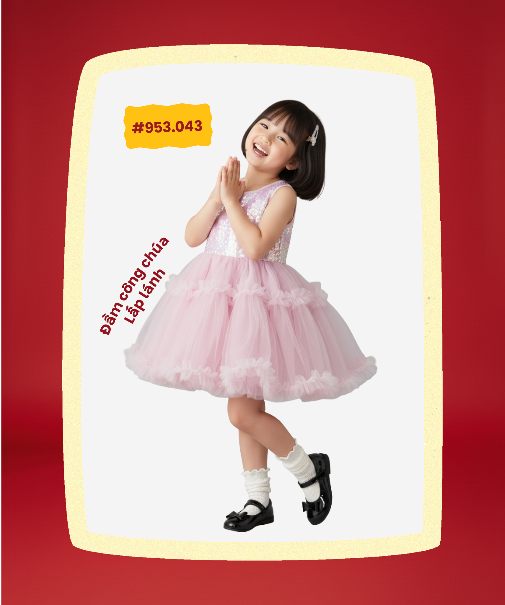 Với những buổi tiệc tất niên hoặc chụp hình gia đình cuối năm, ba mẹ có thể chọn thiết kế Spark of Joy mang sắc đỏ nổi bật, kết hợp cùng chân váy voan bồng bềnh để tạo tổng thể vừa điệu đà vừa rạng rỡ. Outfit này giúp bé lên hình xinh xắn, nổi bật nhưng vẫn giữ được sự nhẹ nhàng, phù hợp không khí sum vầy. Ba mẹ có thể phối thêm tất cao cổ, giày búp bê hoặc áo khoác mỏng để hoàn thiện set đồ cho bé.