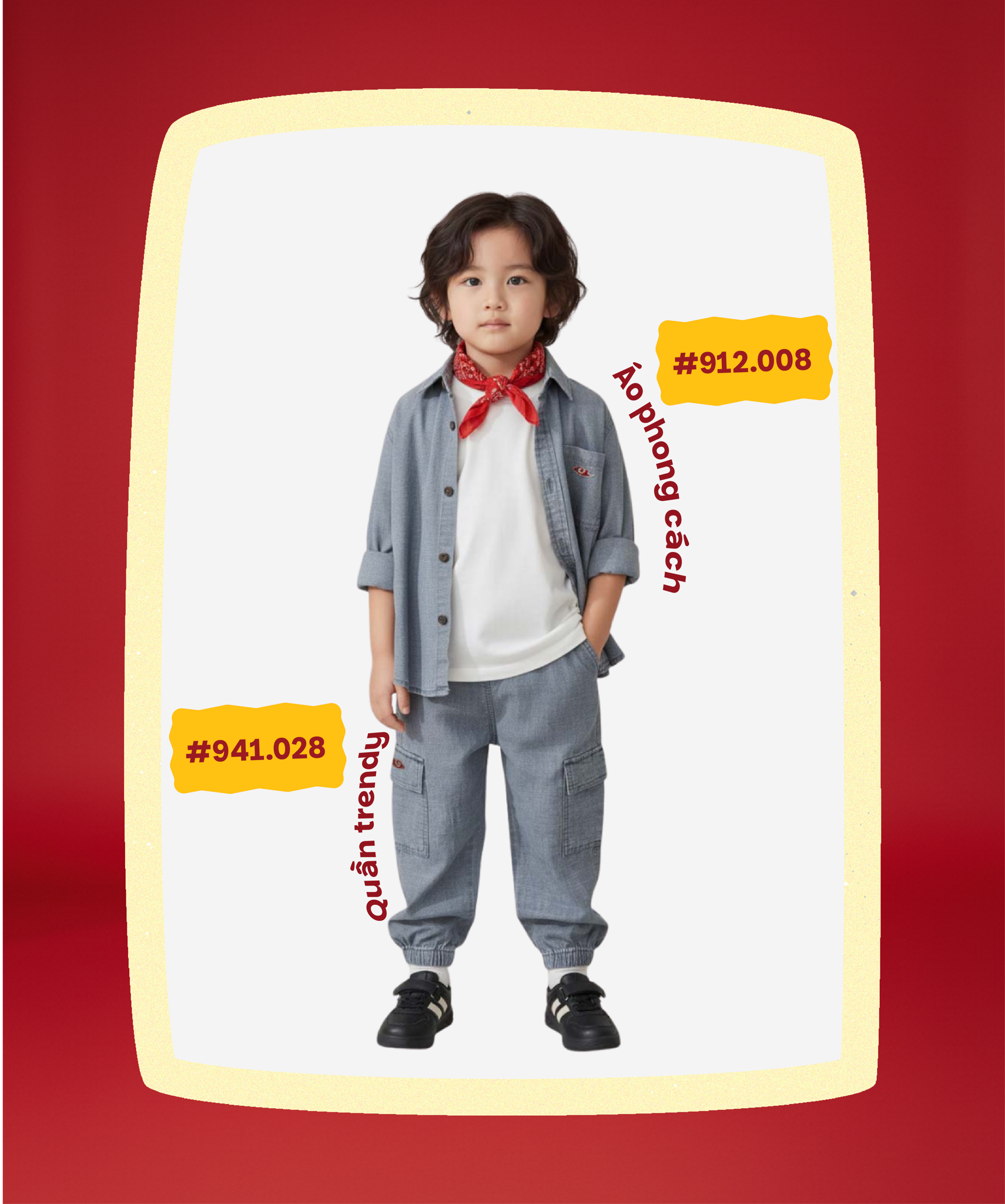 Với các hoạt động ngoài trời hoặc những buổi đi chơi trong dịp lễ, ba mẹ có thể chọn outfit Spark of Joy mang tinh thần năng động hơn. Áo sơ mi đỏ làm điểm nhấn lễ hội, phối cùng quần short form thoải mái giúp bé dễ di chuyển, vui chơi mà vẫn giữ được vẻ gọn gàng. Cách phối này cũng rất phù hợp để tận dụng những item bé đã có sẵn trong tủ đồ, chỉ cần thêm một món thuộc BST Spark of Joy là đã đủ tạo không khí lễ hội.
