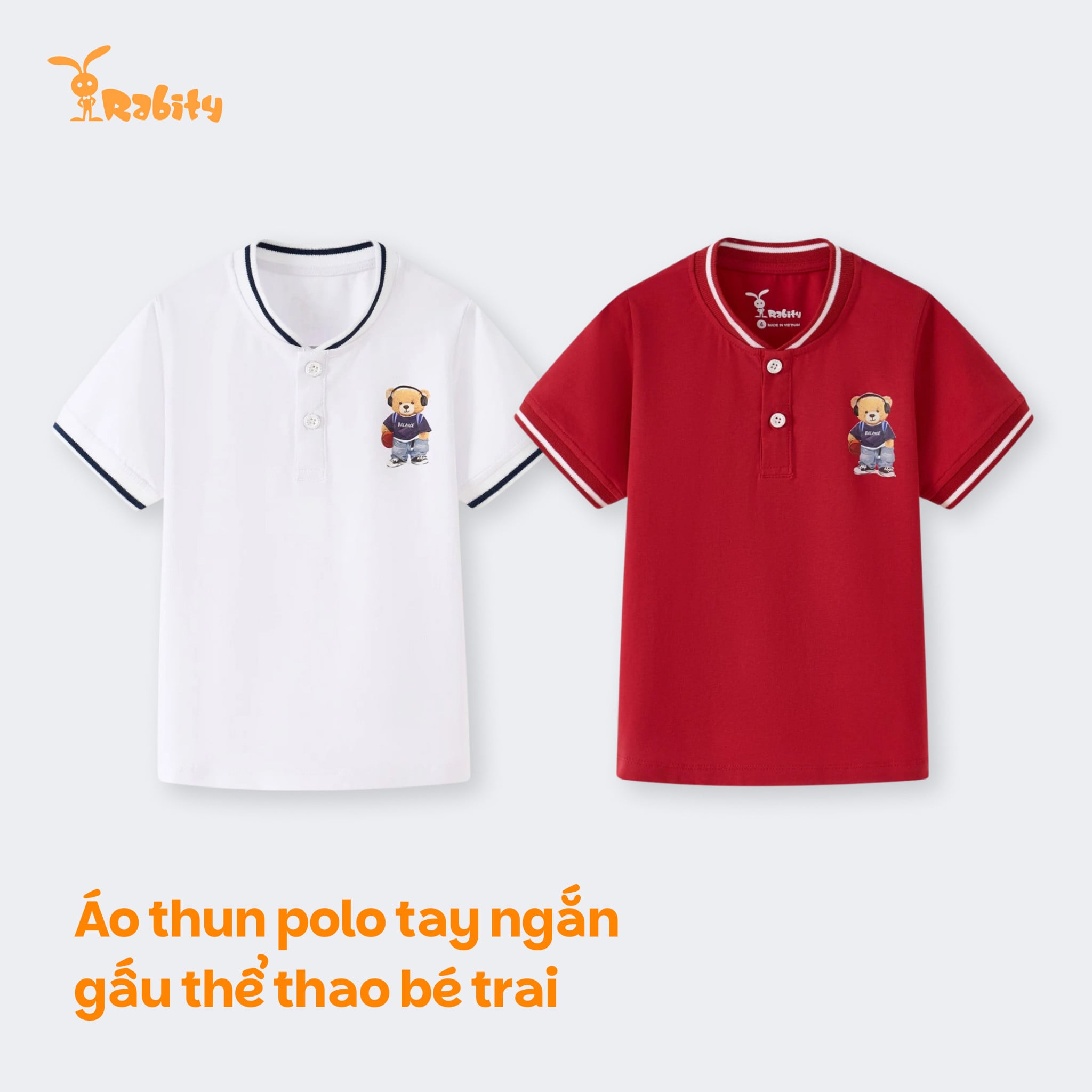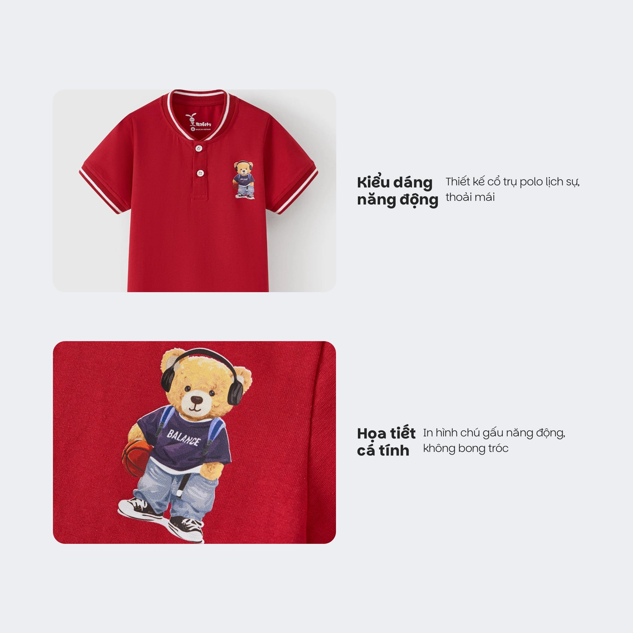 Mẫu áo polo bé trai với hình in chú gấu thể thao đầy cá tính là lựa chọn lý tưởng cho những ngày hè năng động. Thiết kế cổ trụ lịch sự kết hợp chất liệu cotton mềm mịn mang đến sự thoải mái và chỉn chu, phù hợp cả khi đi học hay đi chơi.