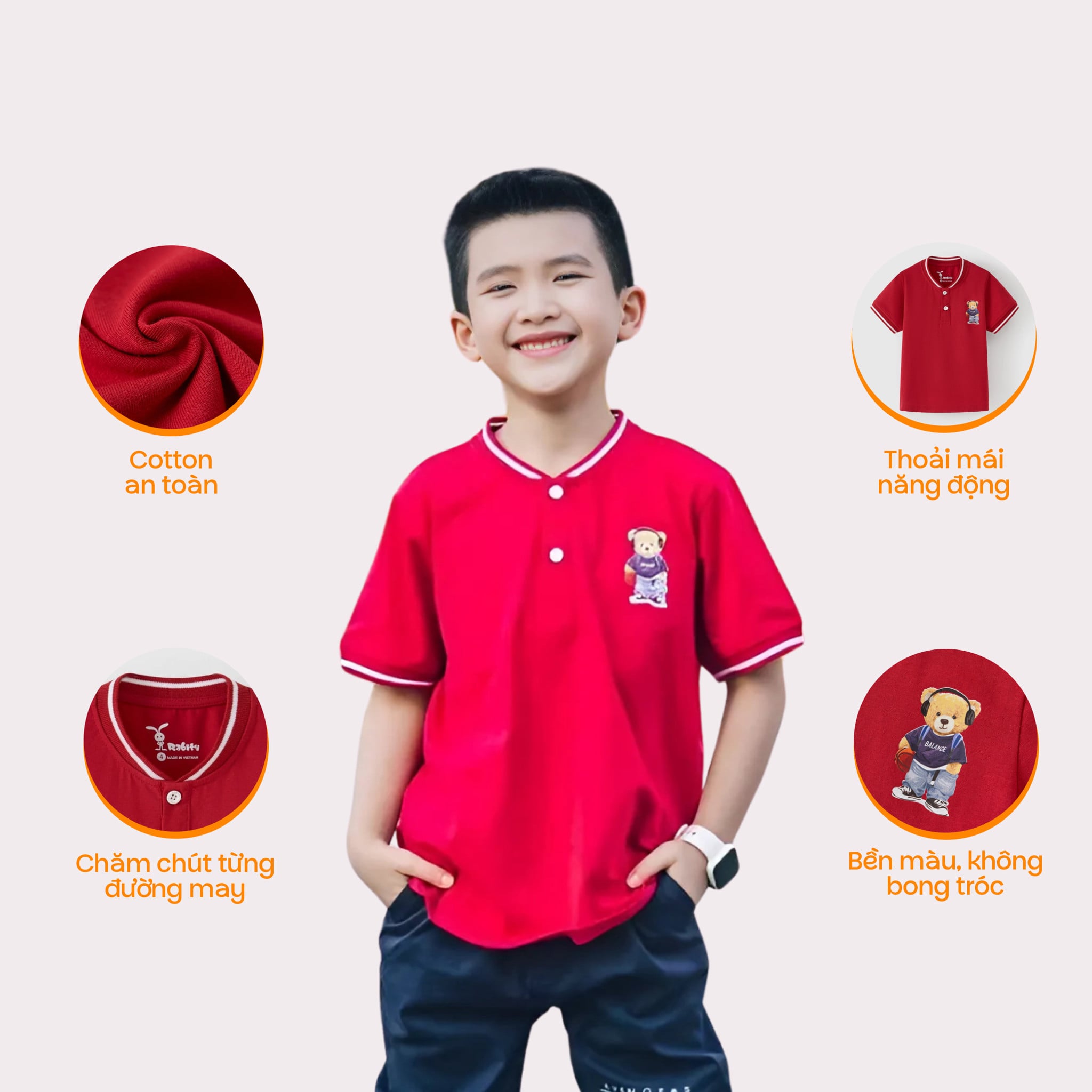 - Kiểu dáng lịch sự: Cổ trụ polo được bo viền chỉn chu, kết hợp đường cắt may gọn gàng giúp áo đứng form và dễ phối với quần short, jeans hoặc kaki. Dù là đi học, đi chơi hay dự tiệc, bé đều trông thật lịch sự và năng động.