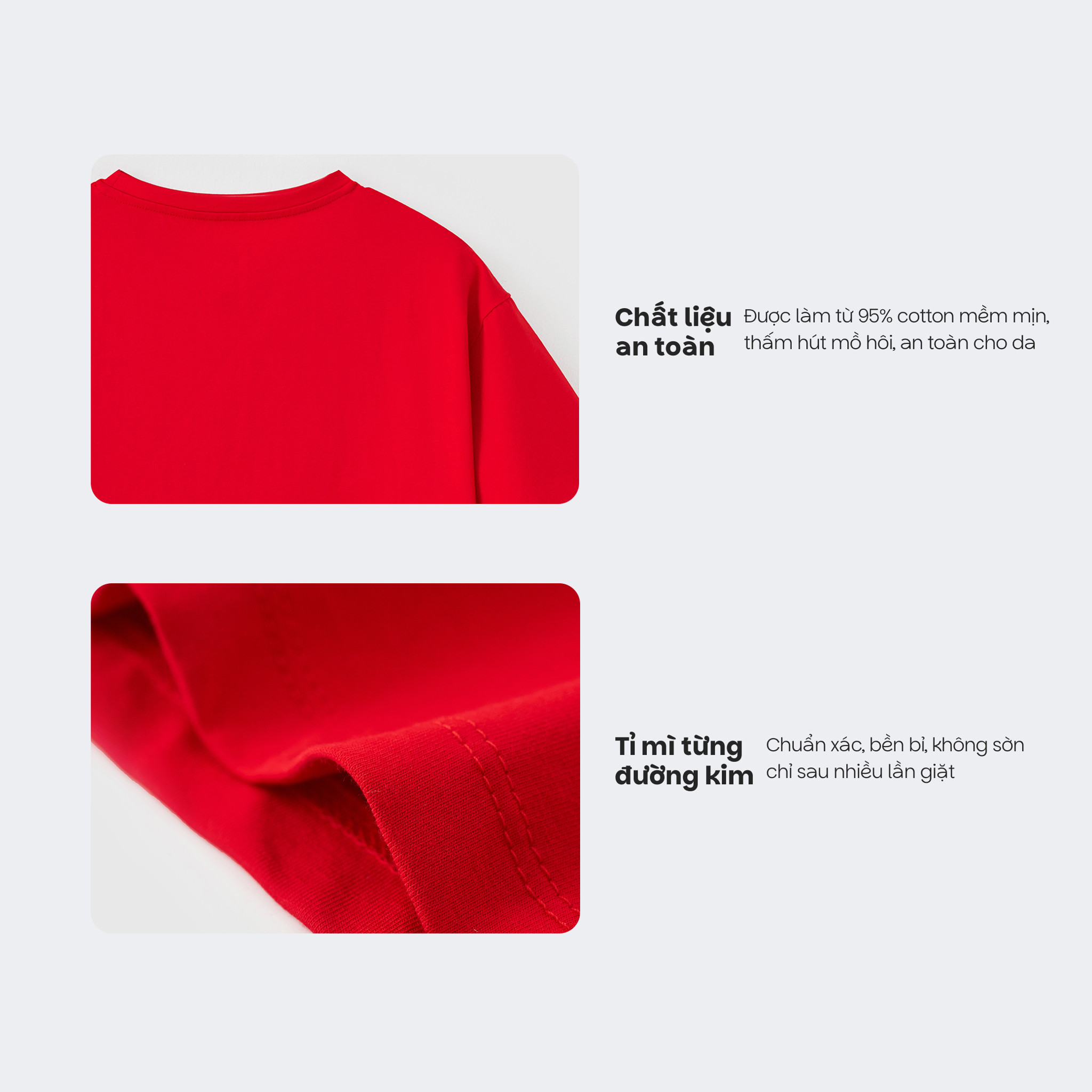 - Kiểu dáng rộng rãi: Chiếc áo được thiết kế với form suông năng động, tay ngắn mát mẻ, phần cổ bo gọn gàng giúp bé mặc dễ dàng và thoải mái trong mọi hoạt động thường ngày.