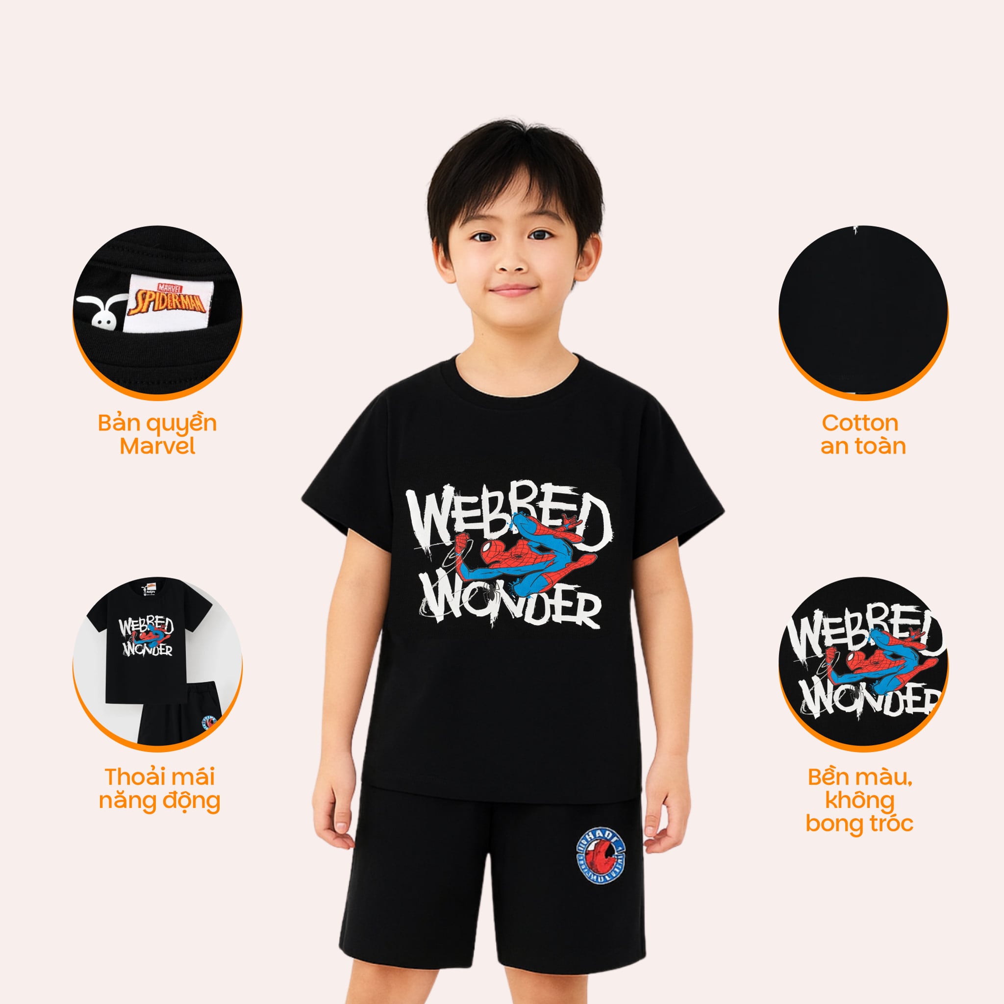 Bộ đồ thun Spider-Man với áo form rộng và quần lưng thun mềm, không hằn ngứa, cho bé tự do chạy nhảy, học tập hay vui chơi suốt ngày dài. Tông màu đen hoặc đỏ cá tính, giúp bé nổi bật mà vẫn dễ phối với các món đồ khác trong tủ.