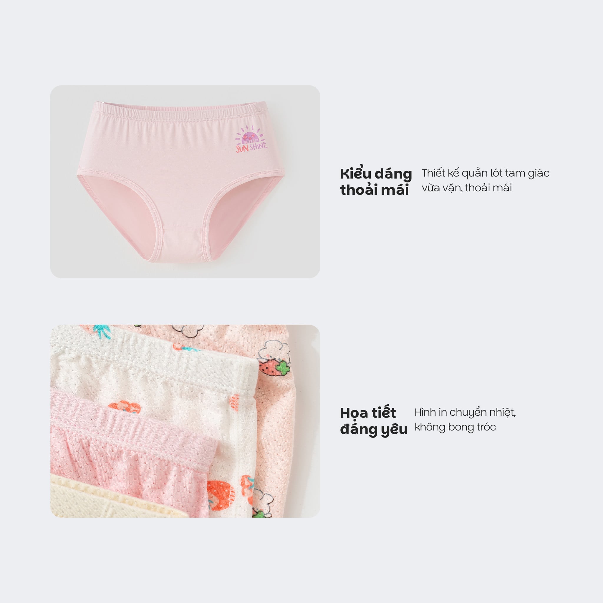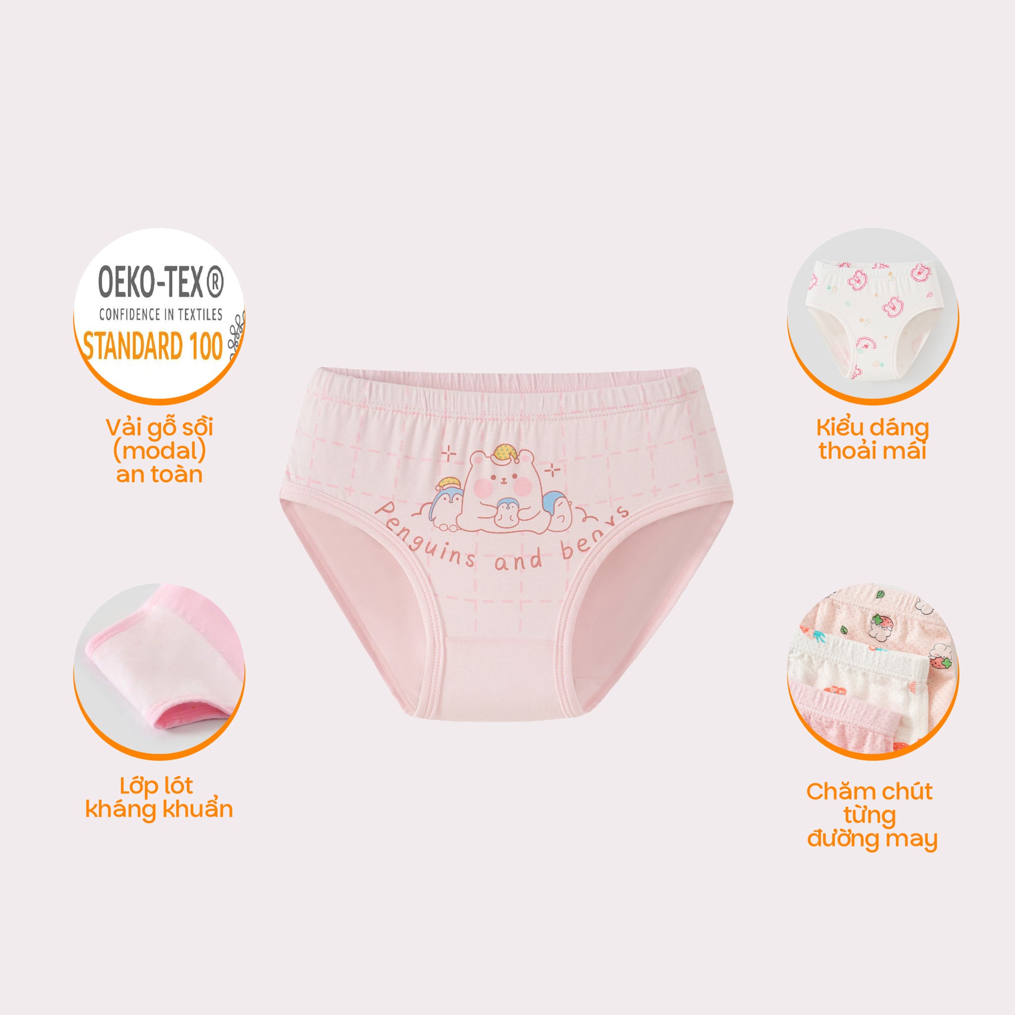 - Dáng tam giác thoải mái, vừa vặn: Thiết kế tam giác truyền thống ôm gọn, nhẹ nhàng, không gây hằn ngứa cho bé. Phù hợp ở mọi tư thế, giúp bé thoải mái và tự do vận động. - Chất liệu Modal gỗ sồi siêu mềm mịn: Sản phẩm được làm từ 95% vải Modal - một loại vật liệu sinh học cao cấp từ cây sồi. Vải Modal nổi tiếng với bề mặt mềm như lụa, mịn hơn cotton thông thường, mang lại cảm giác êm ái, dễ chịu tối đa. - Thoáng khí vượt trội, kháng khuẩn tự nhiên: Cấu trúc vải Modal cho phép không khí lưu thông tốt, giúp bề mặt da bé luôn khô thoáng, ngăn ngừa hăm bí. Chất liệu này cũng có khả năng kháng khuẩn tự nhiên, góp phần bảo vệ sức khỏe vùng kín cho bé. - Co giãn hoàn hảo, ôm vừa vặn: 5% sợi Spandex giúp quần có độ co giãn lý tưởng, ôm vừa vặn theo đường cong cơ thể của bé mà không gây hằn, cấn hay khó chịu, cho bé tự do vận động.