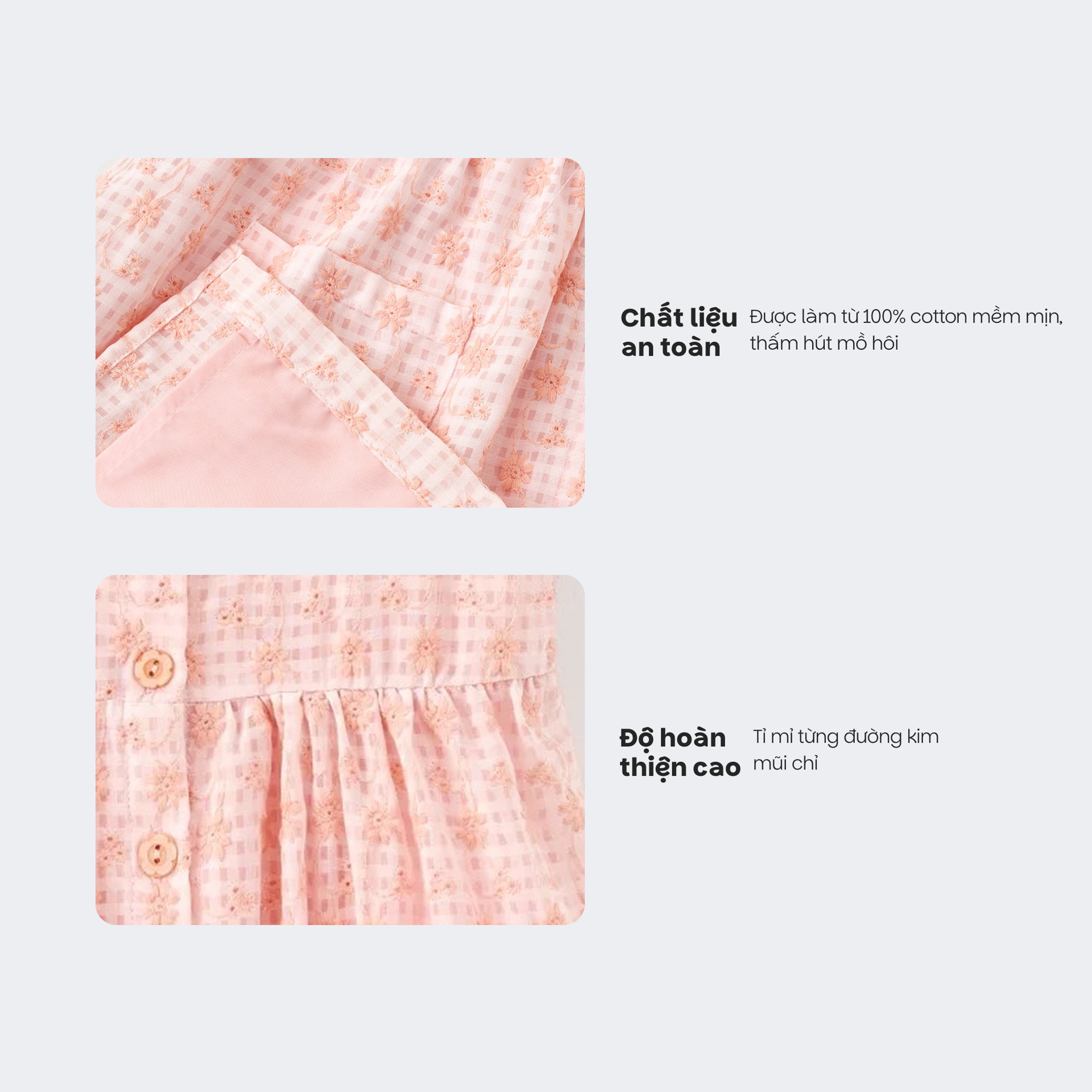 - Chất liệu 100% cotton thô mềm mại: Vải cotton thô vừa mềm vừa có độ thoáng khí và thấm hút cao. Bé có làn da nhạy cảm cũng có thể yên tâm mặc cả ngày. Đồng thời, đầm giữ form tốt sau nhiều lần giặt mà vẫn giữ được độ mềm mại.