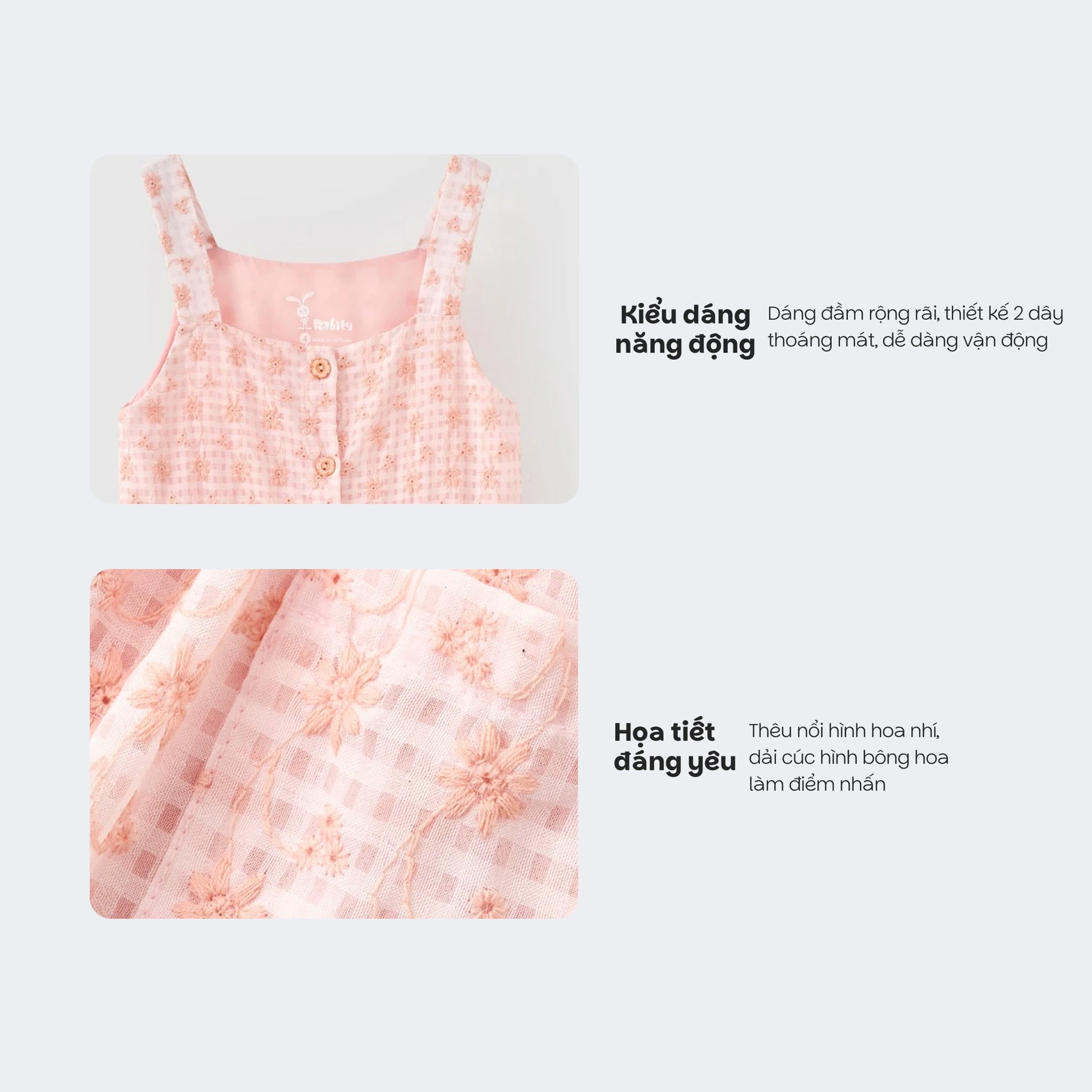- Chăm chút từng chi tiết: Tất cả sản phẩm được Rabity chăm chút kỹ lưỡng trong từng chi tiết, để mỗi chiếc đầm không chỉ đẹp mà còn thực sự thoải mái cho bé yêu.