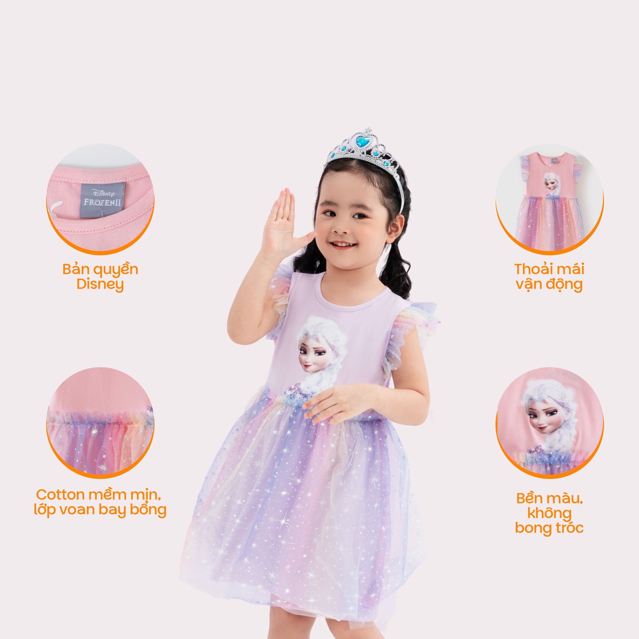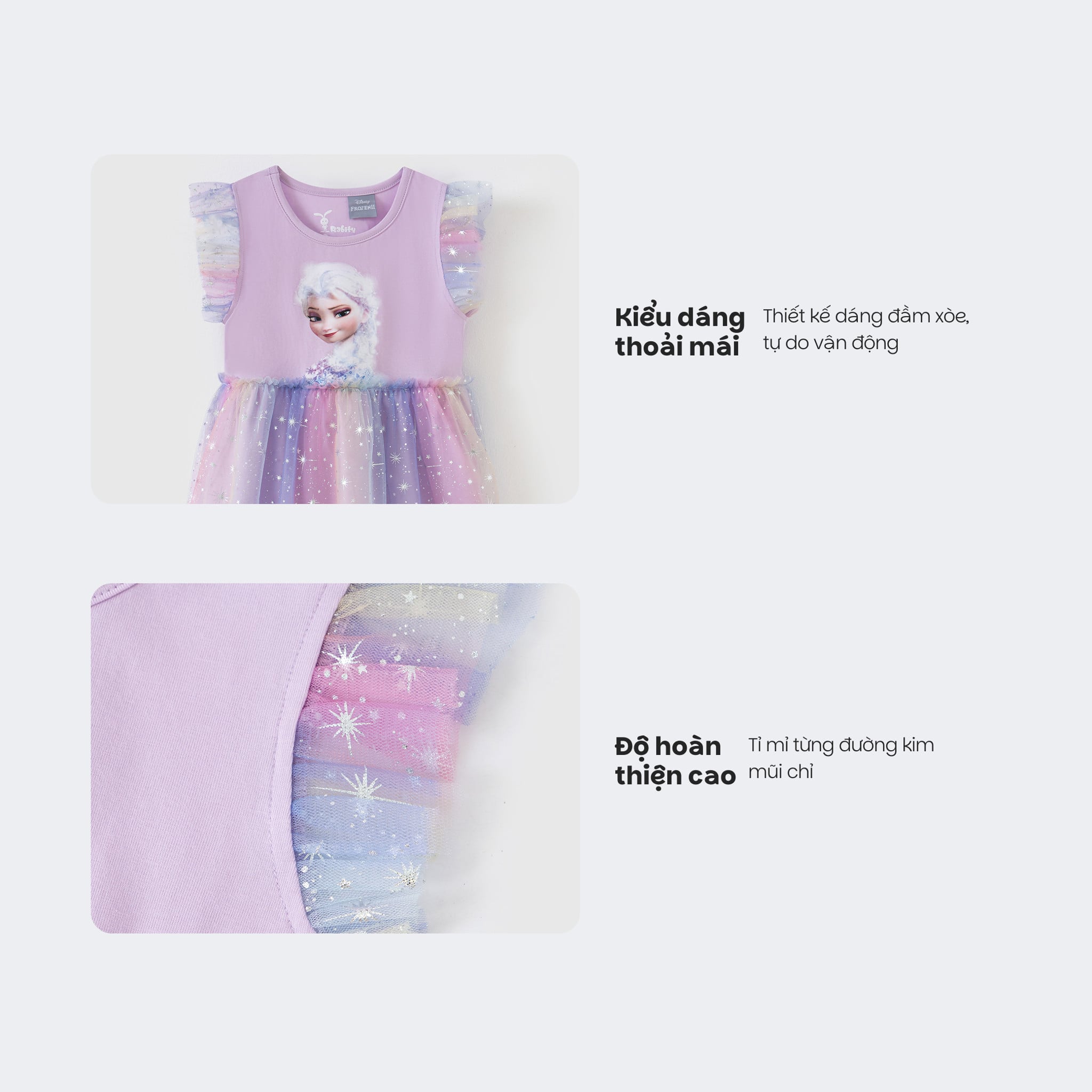 Chất liệu voan mềm mại, bồng bềnh: Lớp voan ngoài cao cấp tạo nên độ xòe phồng tự nhiên, mềm mại và bay bổng theo mỗi bước chân của bé. Họa tiết bông tuyết lấp lánh được in trên nền vải, tái hiện lại thế giới băng giá kỳ diệu của Elsa.