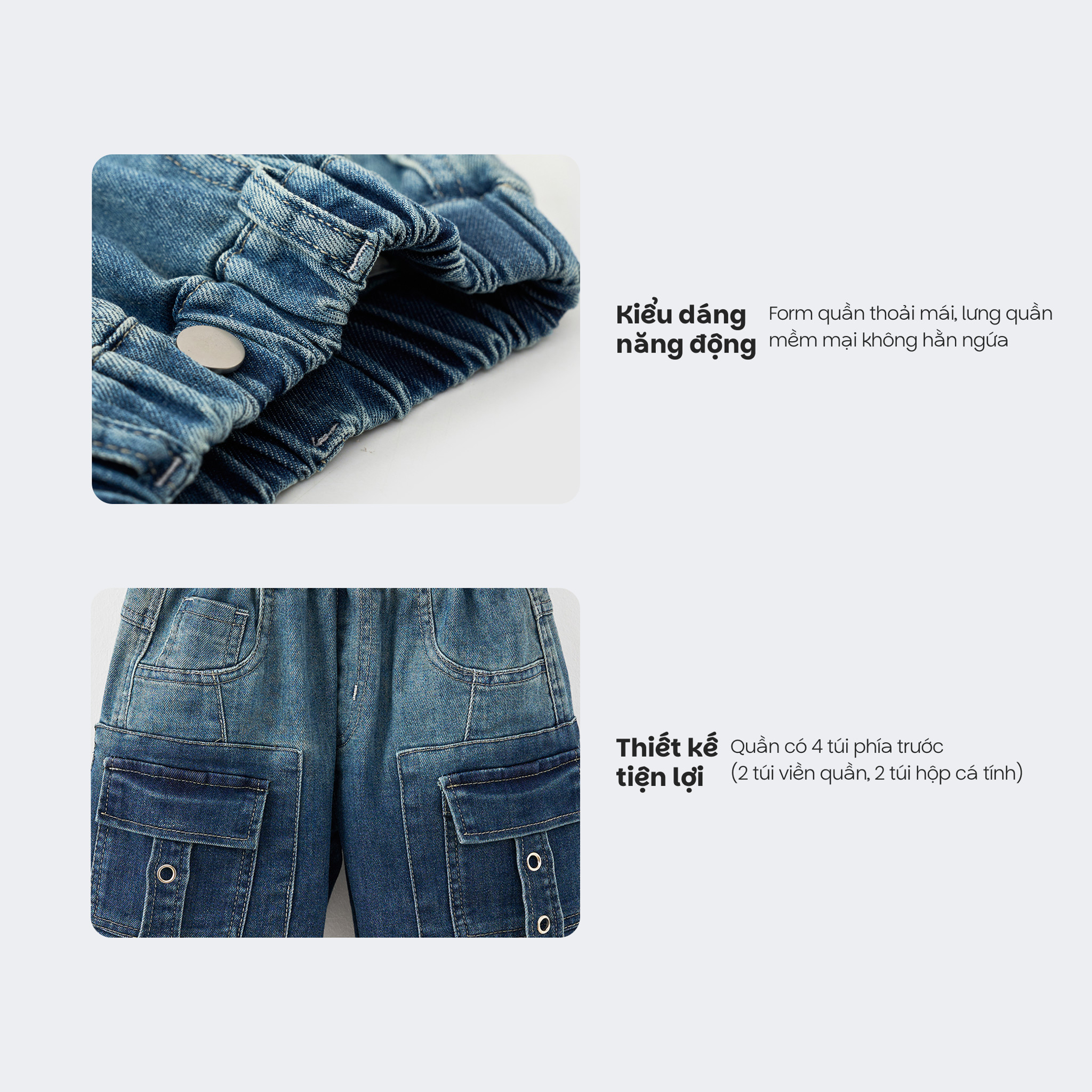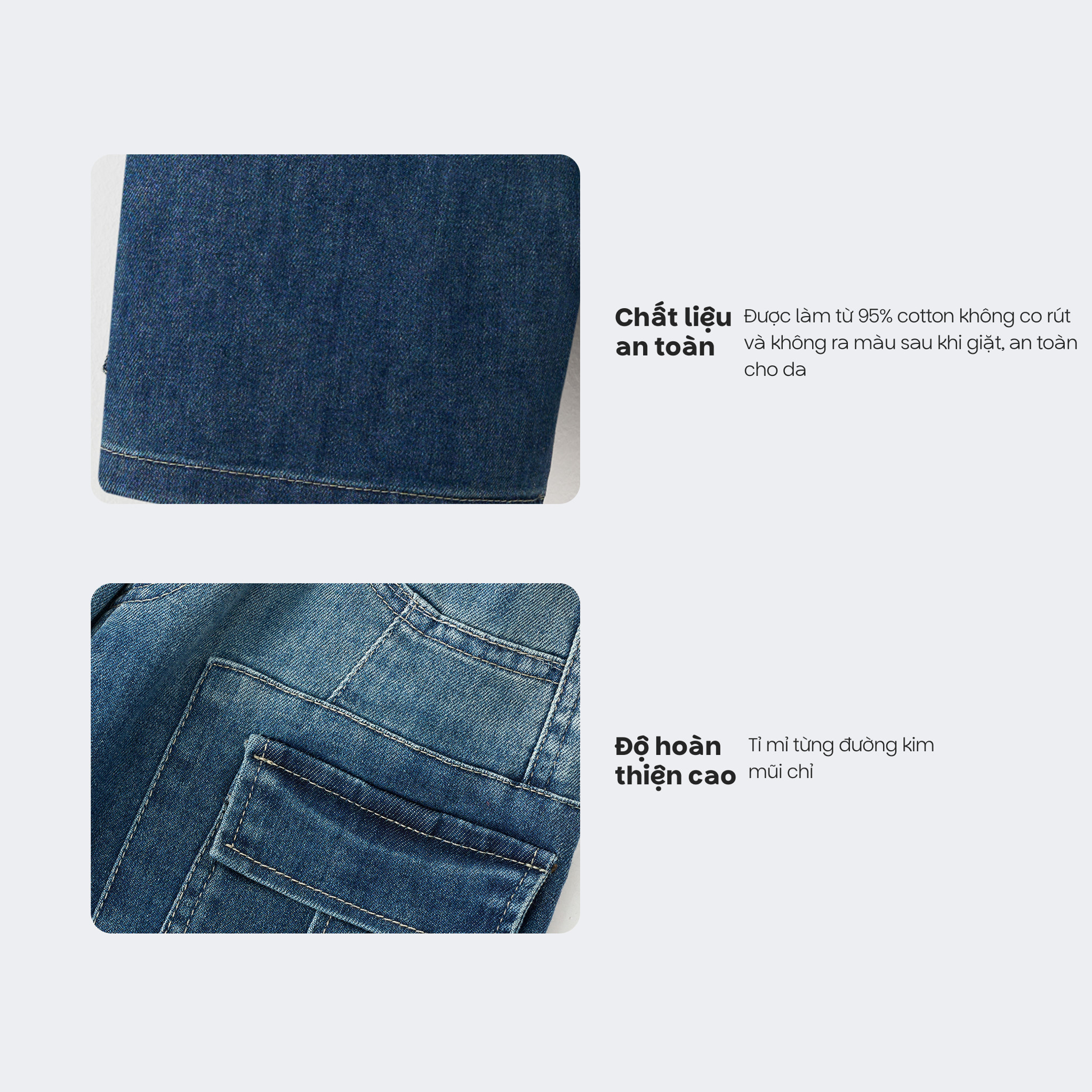 Chất liệu jean mềm nhẹ, bền đẹp: Chất vải jean co giãn nhẹ, không quá dày, tạo cảm giác mềm mại và dễ chịu khi mặc. Bền màu sau nhiều lần giặt và không gây kích ứng cho làn da của bé.